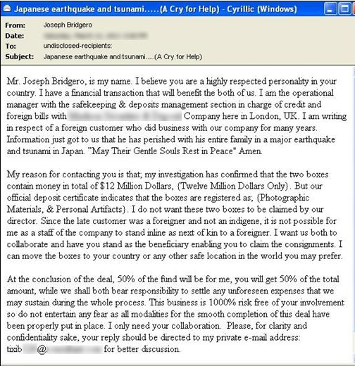 Symantec has observed a a 419-type message that capitalizes on the disaster. It is a fake "next of kin" story that purports to settle millions of dollars owing to an earthquake and tsunami victim: